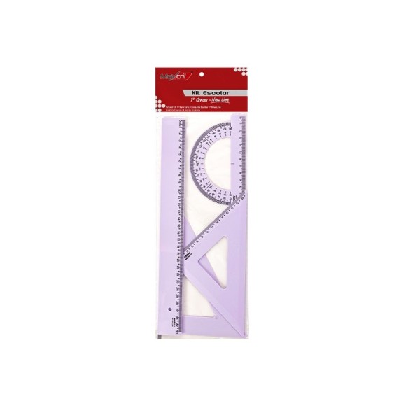 Detalhes: O Kit 1º Grau é composto por quatro peças fundamentais: 1 régua de 30cm, 1 esquadro de 45°, 1 esquadro de 60° e 1 transferidor 180° / Fabricado em poliestireno / Apresenta uma espessura robusta de 3mm / Registro Inmetro: 004395/2020